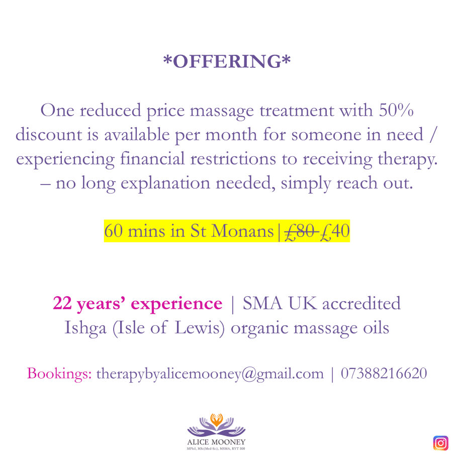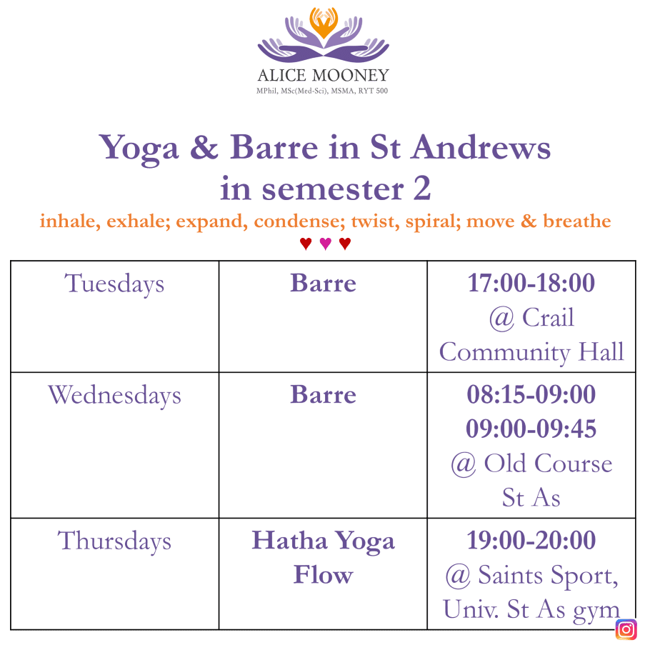 February 2026 ♥ St Monans ~ Barre class at beautiful Crail Community Hall continues and drop-ins are welcome. *NEW 4 WEEK BLOCK* resumes on Tuesday 10/03/26 and includes Tuesdays 17/03/26, 24/03/26 and 31/03/26 8 places available £36 | 4 classes and £10 | drop in (1 class) Email me to book your place I'm excited to invest in 3-days intensive Barre TT in London very soon - The Lotte Berk / Barre Lineage technique - I look forward to sharing refined techniques and refreshed choreography with you in classes in St Andrews and Crail. In Barre class we practice in a small group, high vibration energy moving and breathing through ballet inspired exercise sets to strengthen and condition legs, gluteals (bottom), arms, core, posture, balance, heart and lungs and frame of mind. No dancing happens in Barre class! Complementing this class experience is the physical space with a smooth, clean wooden floor, high ceilings, my professional Harlequin ballet Bares made of beech wood and aluminium to allow us alignment. Each class begins with a dynamic standing warm up to prepare the body and closes with deep releasing stretches and pure grade doTERRA essential oils. Ladies & gents from 16 to 106 years are welcome, teens, athletes, golfers, runners, those reconditioning following injuries and surgeries and some preparing for active holidays skiing, golfing, hiking, wine tasting! ~ Massage Treatments in St Monans, East Neuk of Fife Be nourished with a 60-minute or 90-minute massage treatment - a pause for self-care, to soothe physical, postural and mental aches and pains; to get biofeedback from your body-mind; to let go, decompress and heal with a treatment designed specifically for you from my 22 years' experience and 5 diplomas in bodywork and professional accreditation with the Sports Massage Association UK Using Ishga massage oils - organic and vegan, made in Isle of Lewis, Scotland with Hebridean seaweed extracts and essential oils in a humble yet peaceful space infused with Ishga Hebridean Dreams candle signature oils of lavender, rose geranium, juniper and lemongrass laying on a luxury heated blanket on my original massage plinth handmade using leather and wood by a carpenter in Dublin circa 2004. Some of the intentions of my massage clients receiving treatments include: "release tension" "feel calm, centered and in harmony" "energise" "feel in a calm bubble" "decompress" "reduce neck pain" "feel 21 again!" "feel supple" "be pain free" "relax to lead into a productive day tomorrow" "pain relief" Thank you for trusting in me. It's a true privilege for me as a therapist. As always if you feel in any way unwell with an infectious bug - cold, flu, COVID, strep throat, the plague - please, please reschedule your appointment to a future date when you feel well again. You will never be charged for an appointment that you do not receive. |
